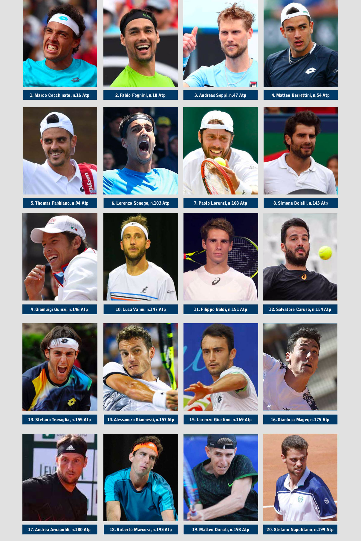 E quelli, sempre intorno ai trenta, che hanno cercato di imitarli senza mai mollare: Thomas Fabbiano, Luca Vanni, Andrea Arnaboldi, Roberto Marcora. Poi c’è un gruppo nel pieno della maturazione, tra i 25 e i 28 anni: Marco Cecchinato, Salvatore Caruso, Stefano Travaglia, Alessandro Giannessi, Lorenzo Giustino.