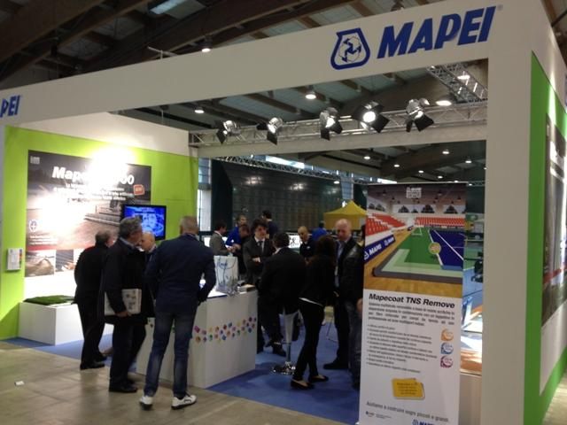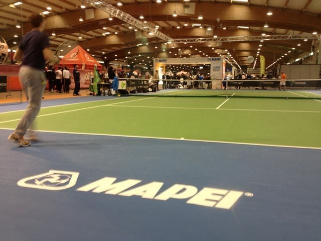 L’idea dei suoi tecnici era stata quella di usare come base un telo di PVC sottilissimo (1,5 mm) spalmato al di sotto con un adesivo speciale Mapei riposizionabile. I teli sarebbero poi stati stesi sulla superficie della struttura indoor dove il campo andava realizzato, uniti tra loro con un sigillante acrilico e spalmati con tre/ quattro strati di Mapecoat TNS Finish.