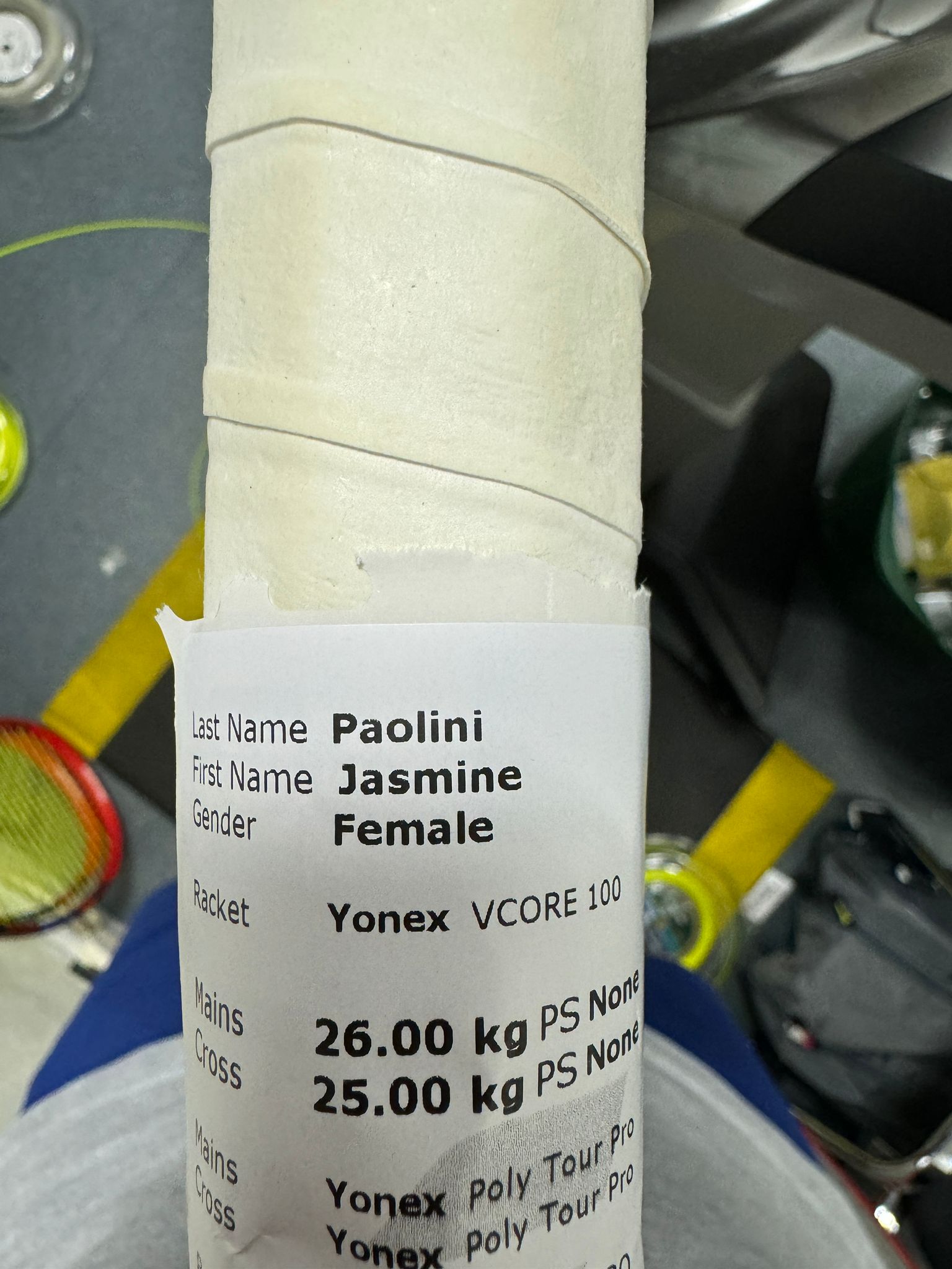 Jasmine a Wimbledon chiede una tensione di 26 kg per le corde verticali e 25 kg per le orizzontali, persino superiore a quella utilizzata normalmente da Rafael Nadal.