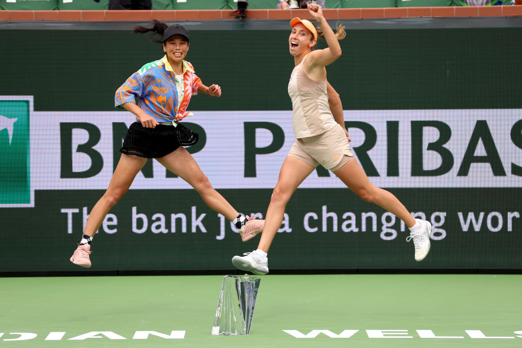 Dopo i quarti a Doha e gli ottavi (una sconfitta all'esordio) a Dubai, nei WTA 1000 in Medio Oriente, iniziano il Sunshine Double con il secondo titolo stagionale a Indian Wells. Le campionesse dell'Australian Open completano un percorso trionfale senza perdere un set, in cui eliminano le teste di serie numero 6 Demi Schuurs/Luisa Stefani, le numero 4 Nicole Melichar-Martinez/Ellen Perez, e in finale le numero 3 Storm Hunter/Katerina Siniakova. Festeggiano così il secondo titolo come duo nel primo WTA negli USA. Complessivamente Mertens trionfa per la terza volta a Indian Wells, la 20ma in carriera nel circuito WTA in doppio femminile. Hsieh raggiiunge i 34 titoli totali e trionfa per la quarta volta a Indian Wells. Dopo il torneo torna numero 1 del mondo in doppio. Hsieh e Mertens chiudono il Sunshine Double con una sconfitta ai quarti a Miami.