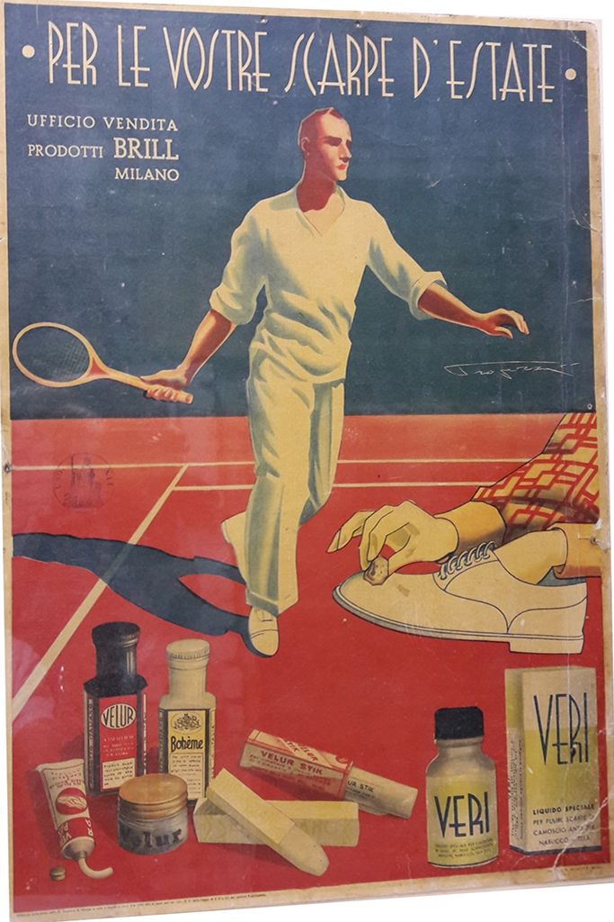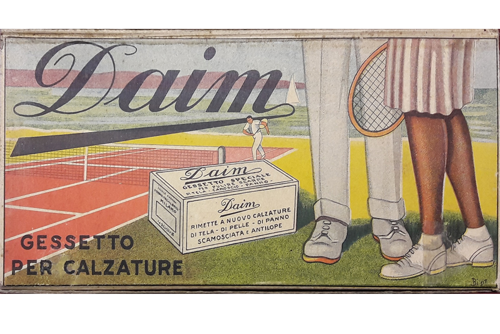 Eseguite per lo più da validi artisti, erano delle vere opere d’arte. Oggigiorno questi articoli non sono di facile reperibilità. In questa sede ecco due pezzi interessanti risalenti a metà anni trenta: un manifesto della ditta Brill di Milano dal titolo “Per le vostre scarpe d’estate” con un tennista di bianco vestito in primo piano, e una bella scatola litografata di cartone della milanese Daim, contenente ancora i suoi gessetti bianchi originali. Sicuramente un filone d’oggetti da collezionare, magari secondario, ma sicuramente interessante.