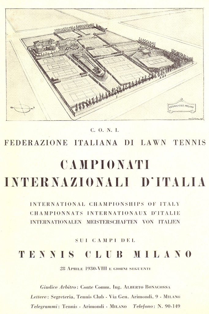 Per gli appassionati italiani di tennis il mese di maggio si identifica da sempre con il più importante torneo tennistico del nostro Paese: gli Internazionali BNL d’Italia. Questo torneo, salvo rarissime eccezioni, si è quasi sempre disputato nel meraviglioso impianto del Foro Italico di Roma. La prima edizione venne organizzata tuttavia, nel lontano aprile 1930, sui campi del prestigioso Tennis Club Milano e vide la partecipazione dei più grandi tennisti dell’epoca tra cui Bill Tilden che si aggiudicò il titolo di singolare battendo in finale il nostro Uberto De Morpurgo. Rievocando questa competizione ecco che salta fuori il raro programma edito dalla rivista Tennis e Golf che contiene nelle dodici pagine immagini del TC Milano, la piantina dell’impianto e dei vari settori del campo centrale, le modalità d’iscrizione ed anche curiosi consigli agli spettatori come quello di non applaudire un doppio fallo o una palla ‘net’.
